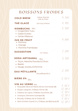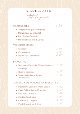 Pour te lever du bon pied :  Une boisson chaude*, un jus de fruit, croissant ou chocolatine, du pain au levain, beurre AOP Poitou Charente, confiture maison ou miel, fromage blanc et granola  – 15€ *+1€ Chocolat Chaud, Matcha, Chai +2€ Suggestions