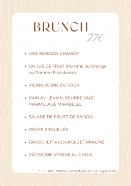 Le plaisir incontournable du week-end. Il est composé d’une boisson chaude*, d’un jus de fruit, une viennoiserie , de pain au levain, beurre AOP Poitou Charente, confiture, une gourmandise salé, une salade de fruit de saison et d’un dessert (le plat et le dessert changent tous les mois)- 27€ – *+1€ Chocolat Chaud, Matcha, Chai +2€ Suggestions