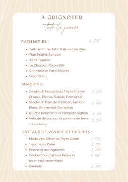 Le plaisir incontournable du week-end. Il est composé d’une boisson chaude*, d’un jus de fruit, une viennoiserie , de pain au levain, beurre , confiture, une gourmandise salé, une salade de fruit de saison et d’un dessert (le plat et le dessert changent tous les mois)- 27€ – *+1€ Chocolat Chaud, Matcha, Chai +2€ Suggestions