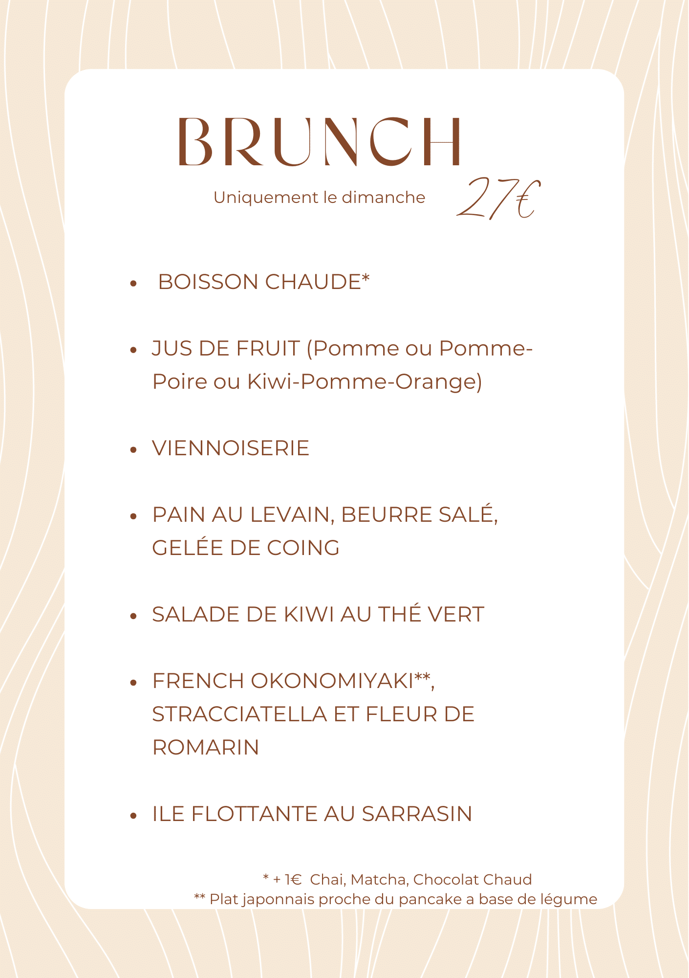 Le plaisir incontournable du week-end. Il est composé d’une boisson chaude*, d’un jus de fruit, une viennoiserie , de pain au levain, beurre , confiture, une gourmandise salé, une salade de fruit de saison et d’un dessert (le plat et le dessert changent tous les mois)- 27€ – *+1€ Chocolat Chaud, Matcha, Chai +2€ Suggestions