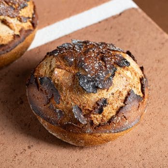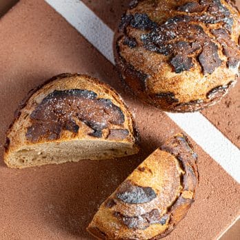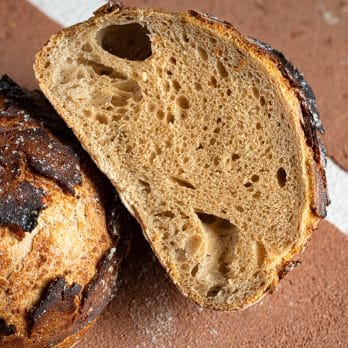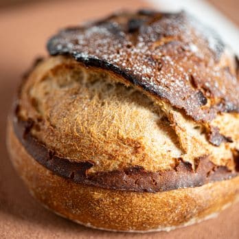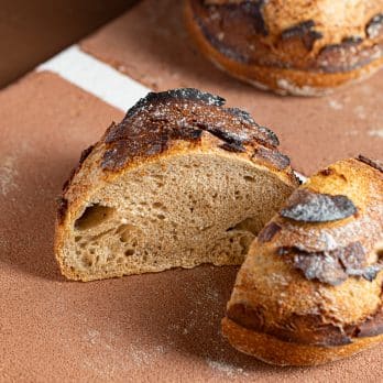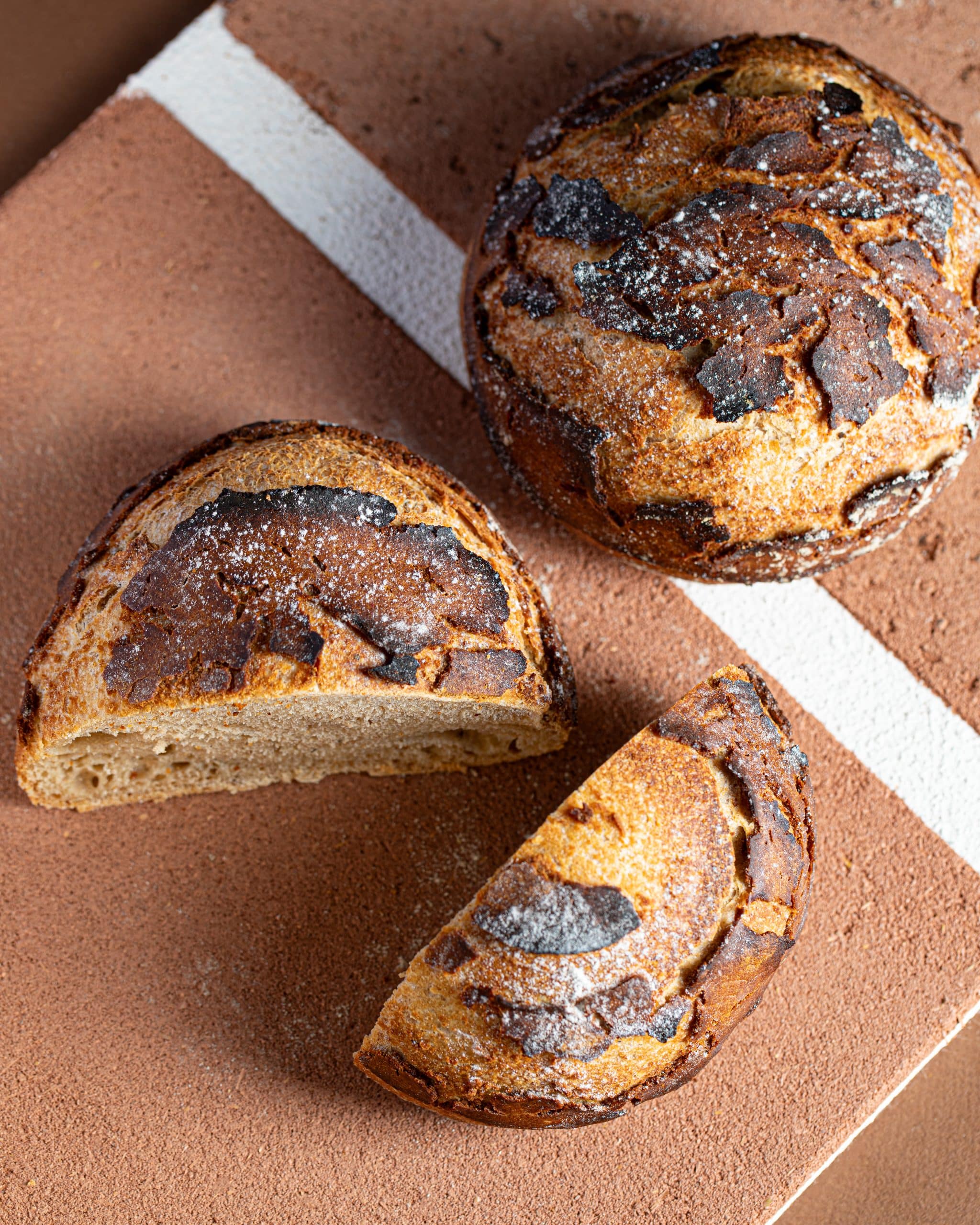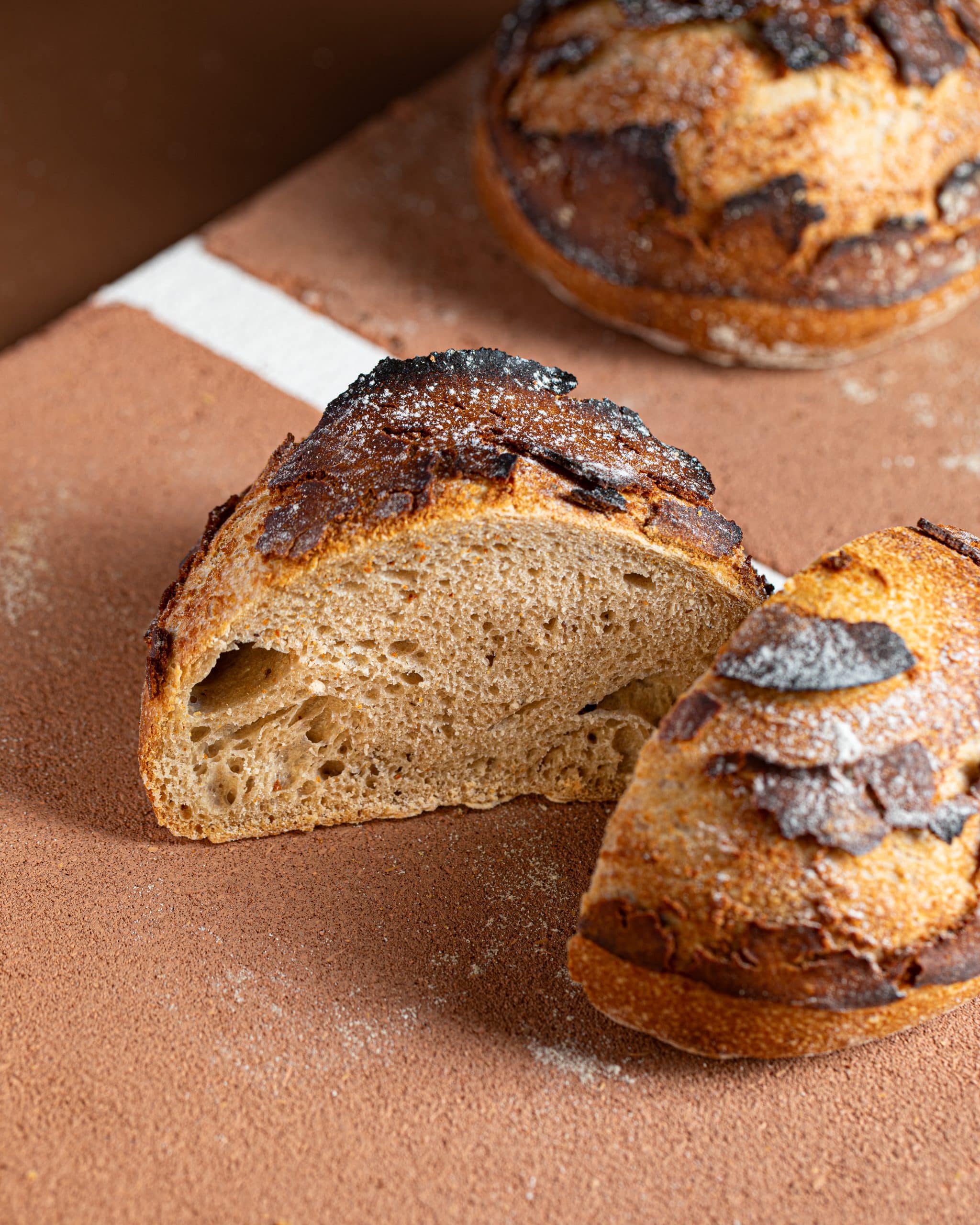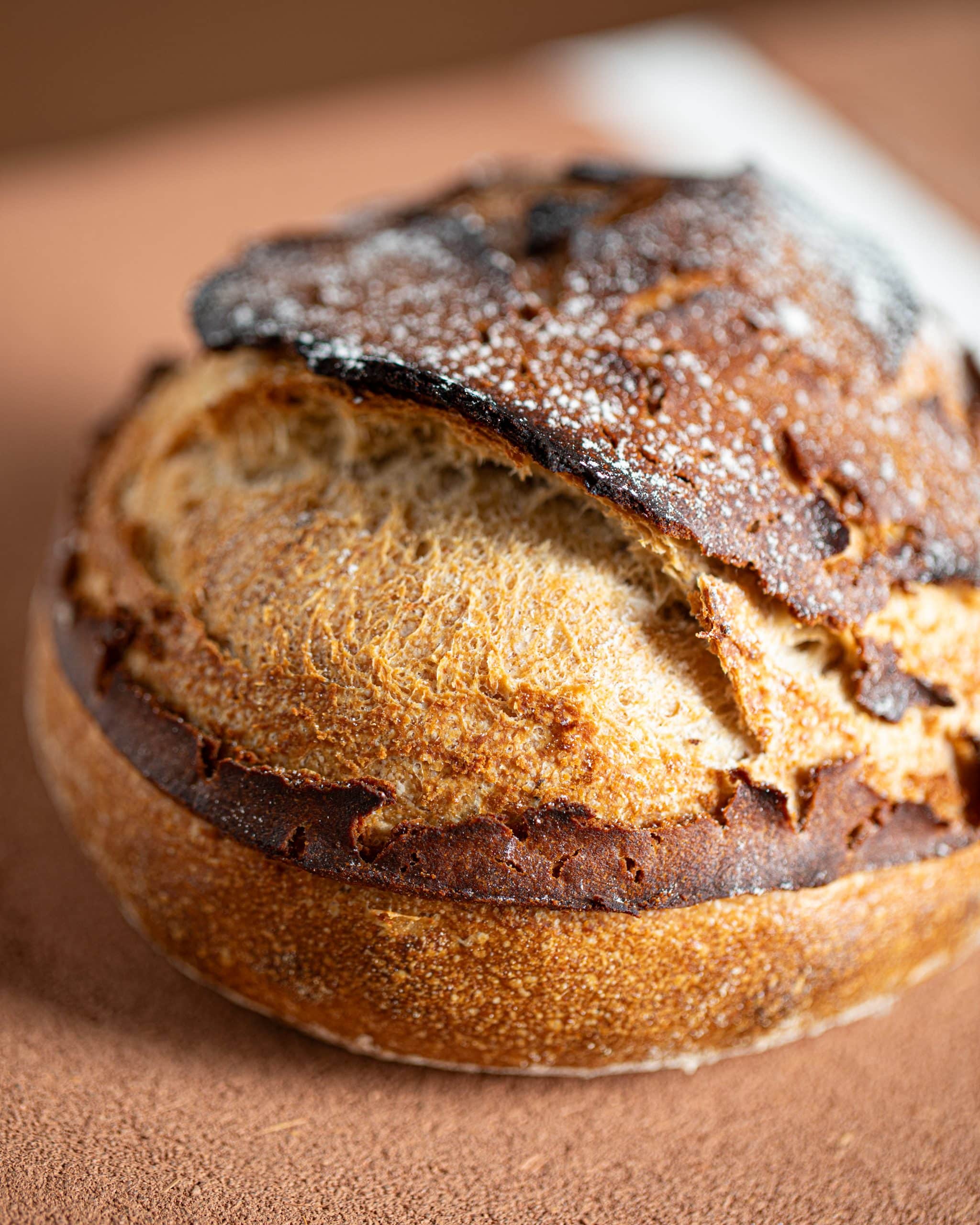 Pain de campagne au levain. Un assemblage de farine de seigle et farine de blé, provenant du Moulin de Courneau en Gironde. En format boule de 300g, un pain de partage, une mie assez serrée, idéal pour les tartines du petit déjeuner ou pour saucer un plat.
