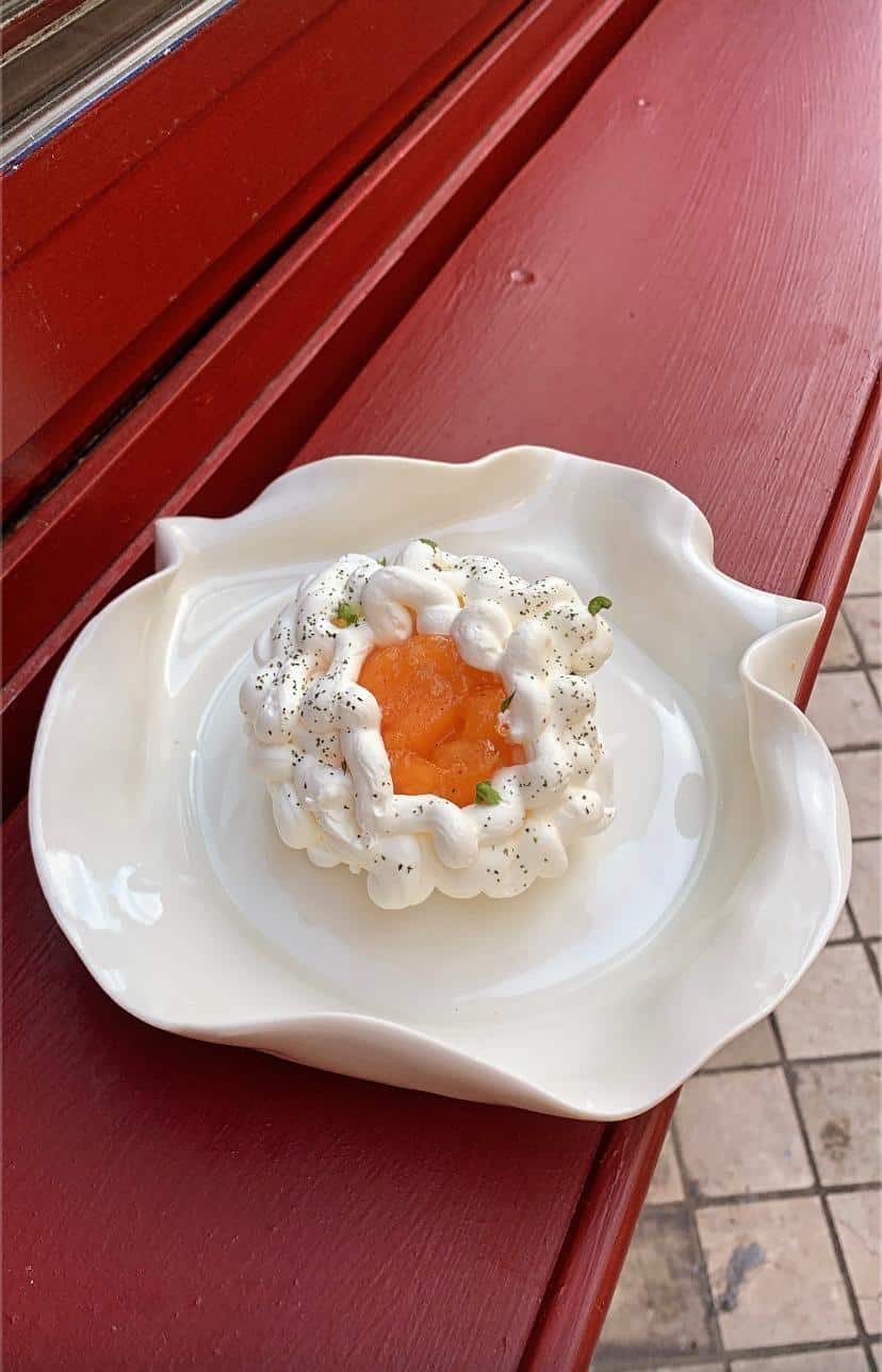 Meringue légèrement croustillante à l’extérieur et moelleuse au cœur. Melon frais et compoté et chantilly au basilic