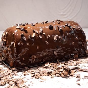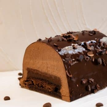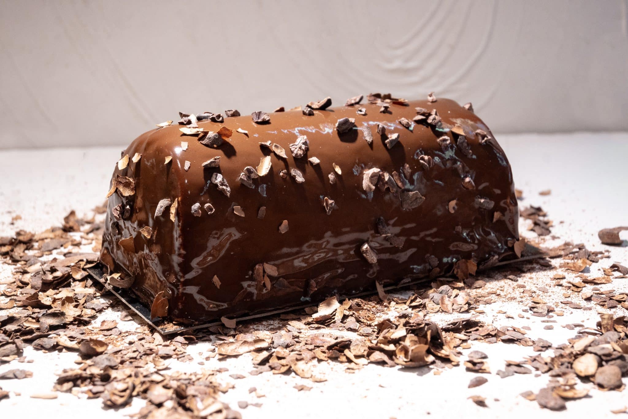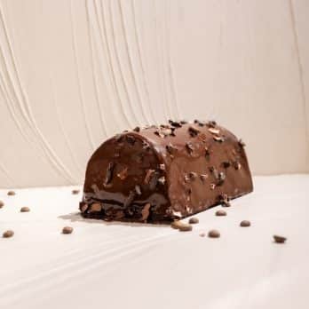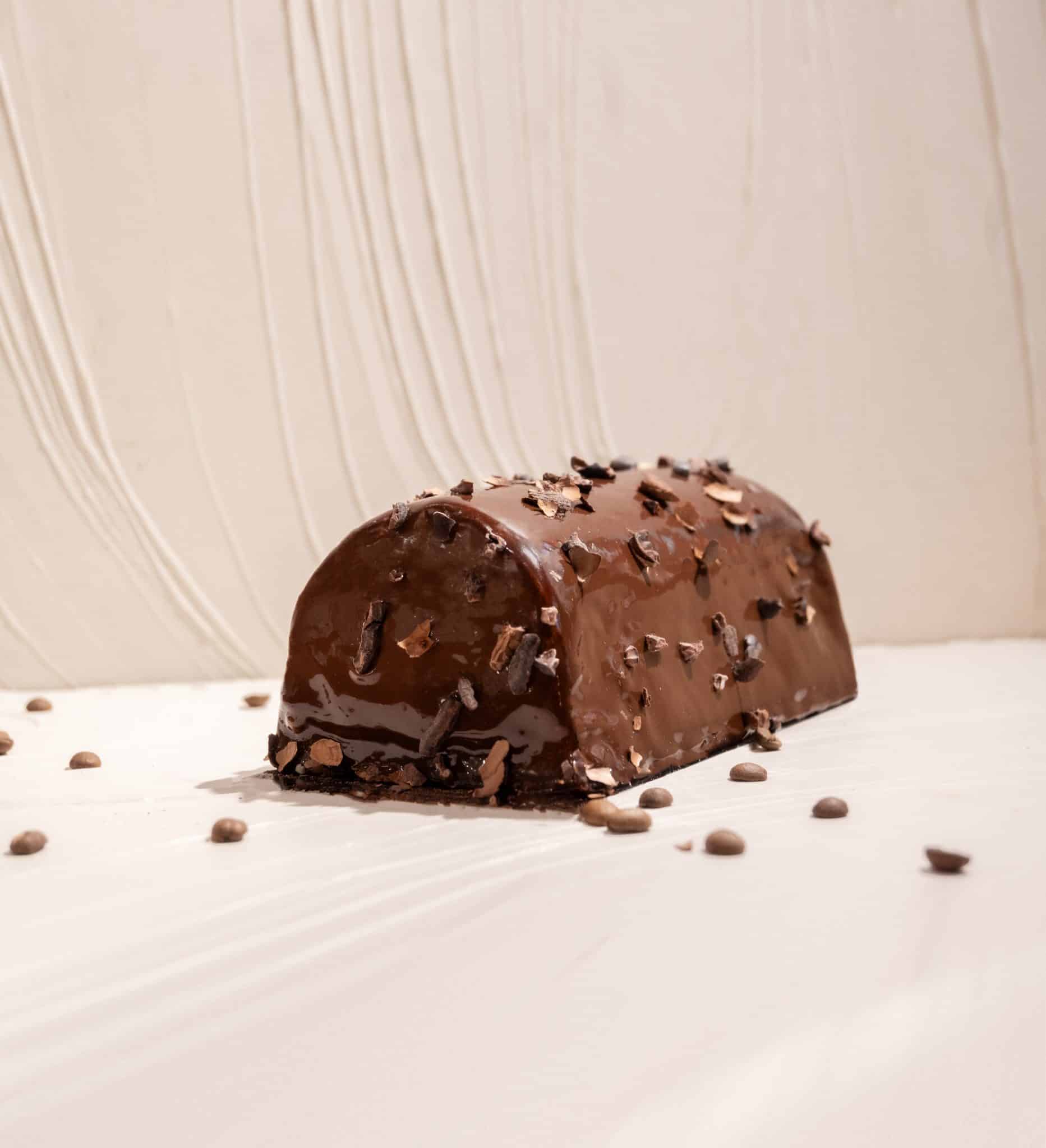 Biscuit moelleux au cacao, Croustillant café et grué de cacao, ganache intense chocolat Pérou 65% et expresso, mousse onctueuse chocolat et café, glaçage miroir cacao pour faire briller vos fêtes.
