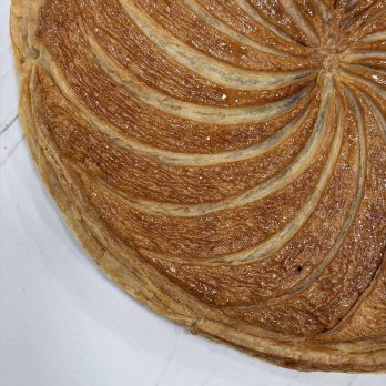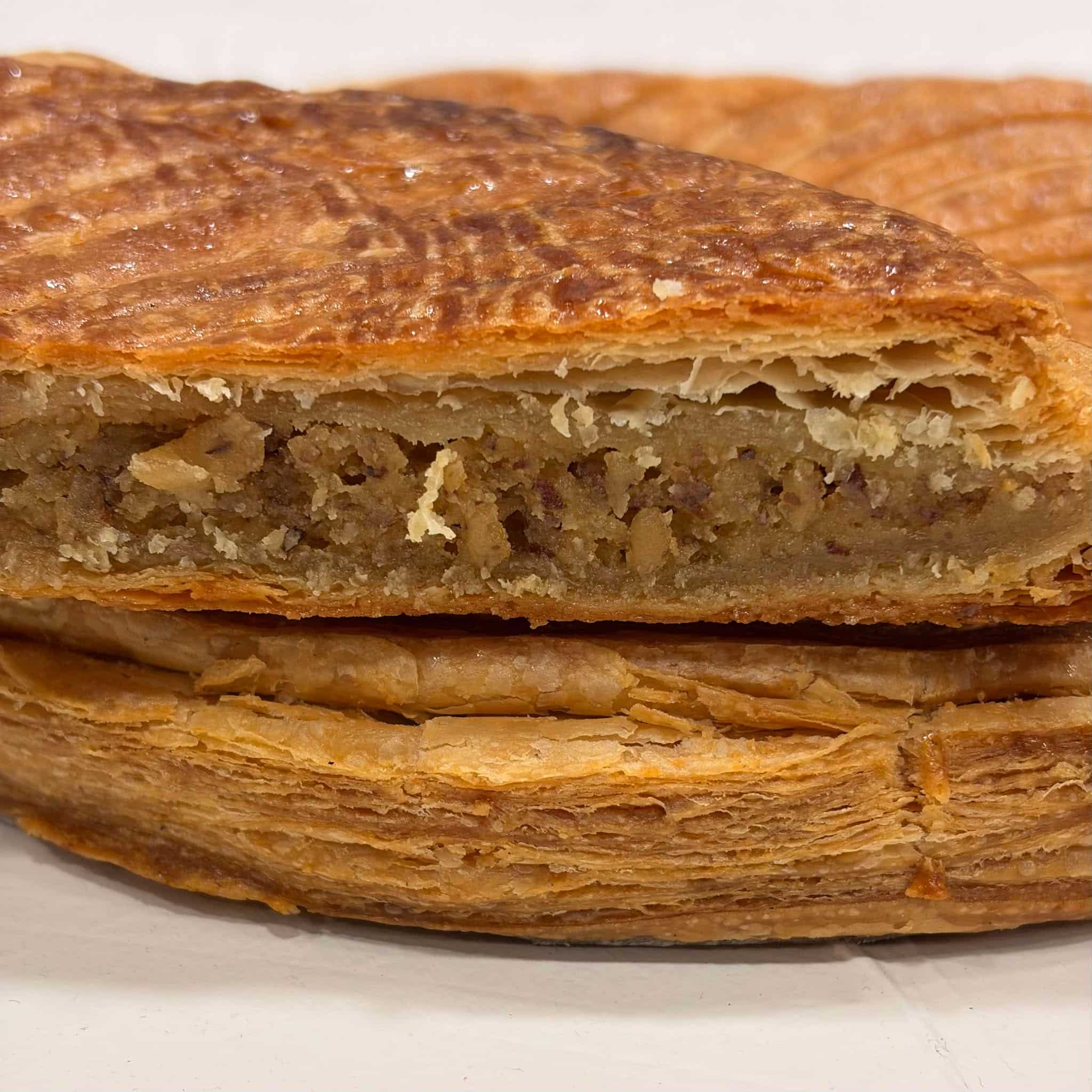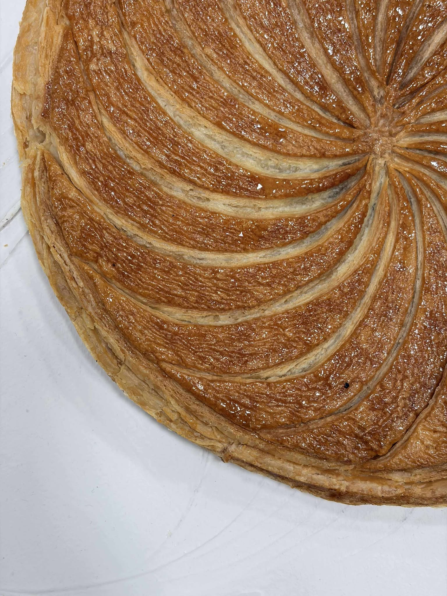 Galette réalisée avec un feuilletage viennois (croisement entre le feuilletage et la brioche) et garnie de frangipane.