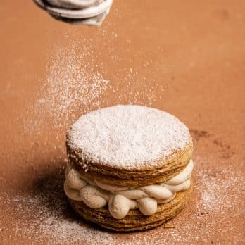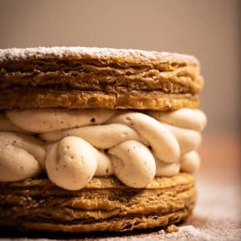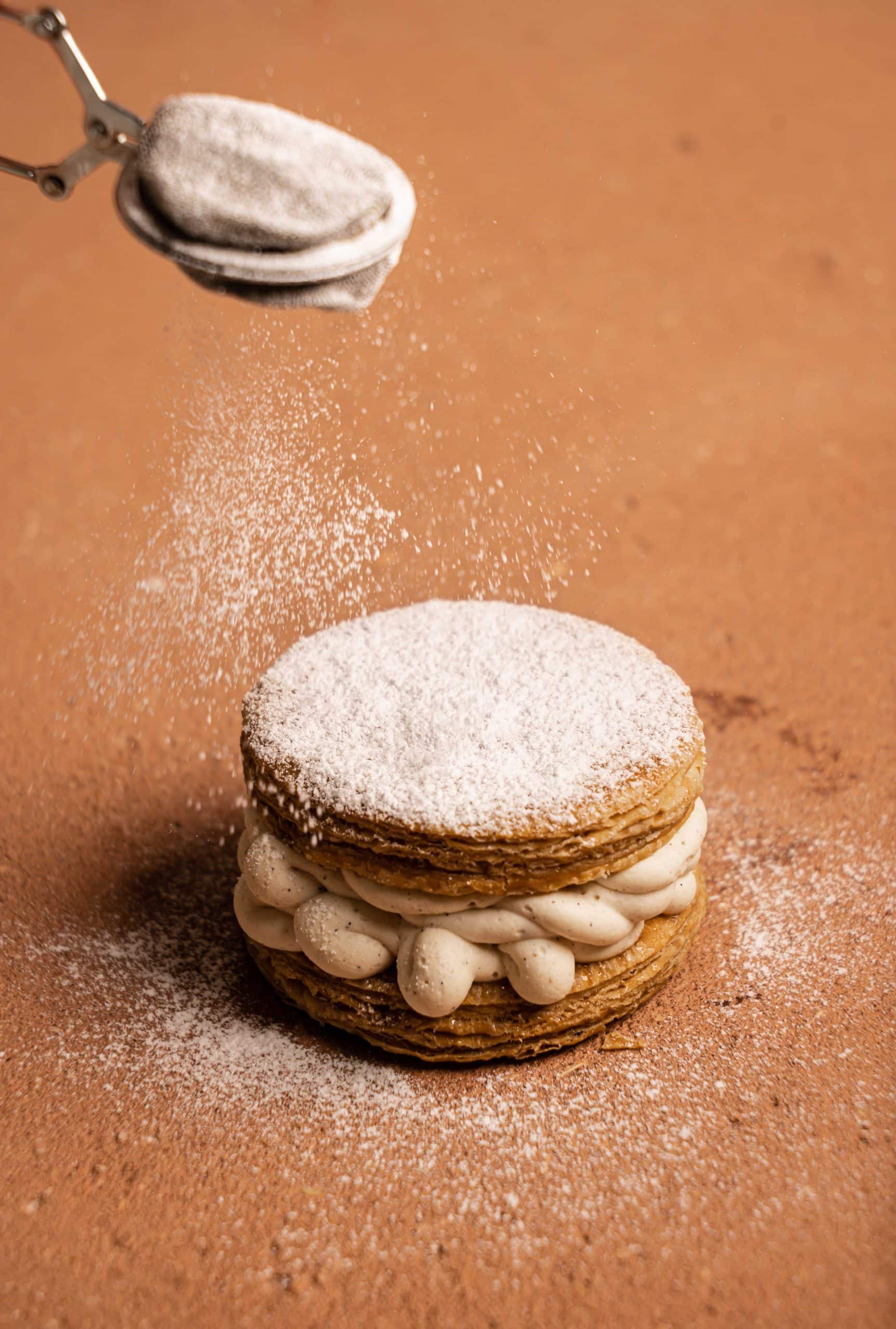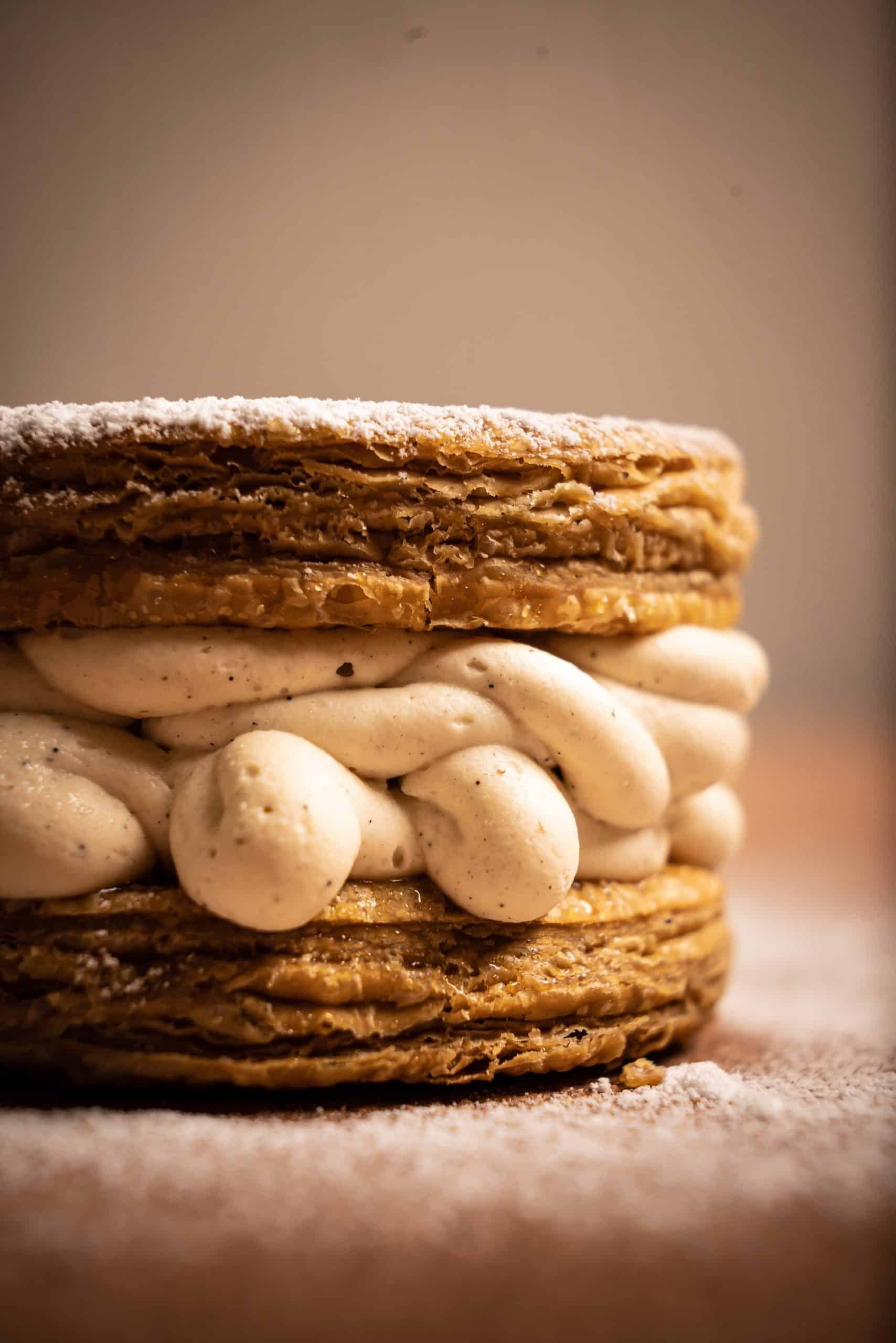 Millefeuille à la vanille et coing composé du feuilletage classique, d’une crème à la vanille et d’une compoté de coing