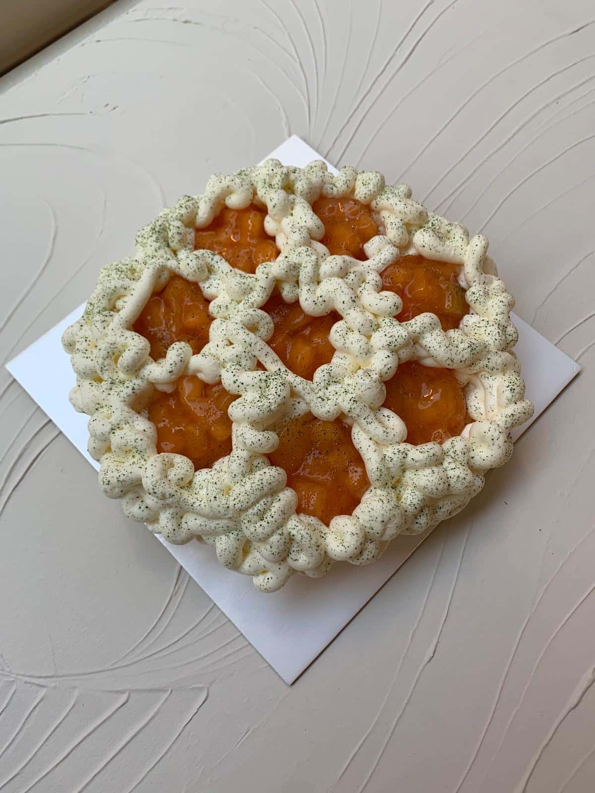 Meringue légèrement croustillante à l’extérieur et moelleuse au cœur. Melon frais et compoté et chantilly au basilic